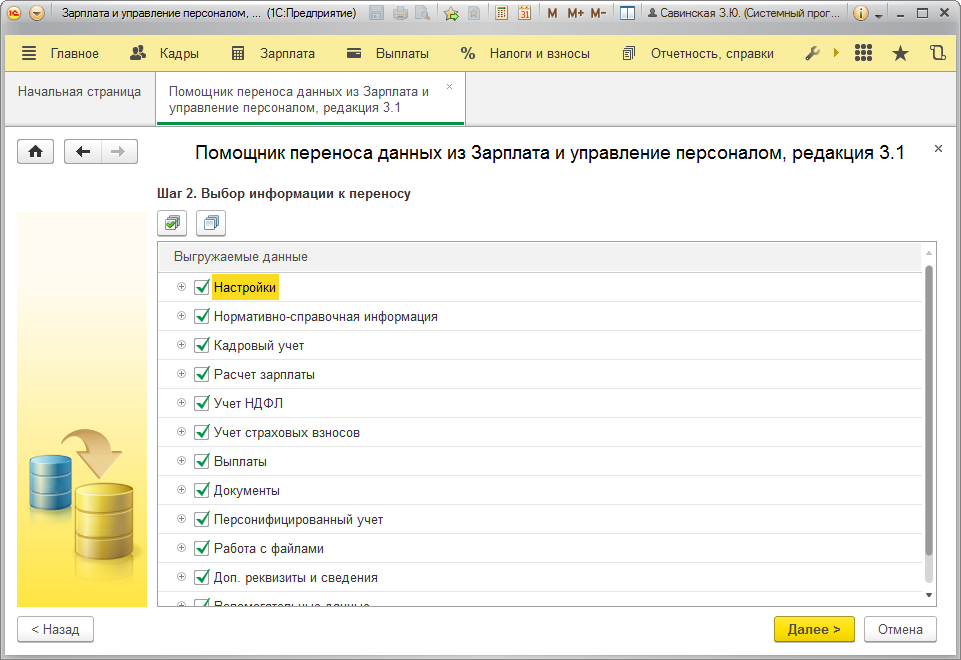 После завершения загрузки данных требуется проверить корректность переноса настроек кадрового учета и расчета зарплаты, а также общих настроек программы.