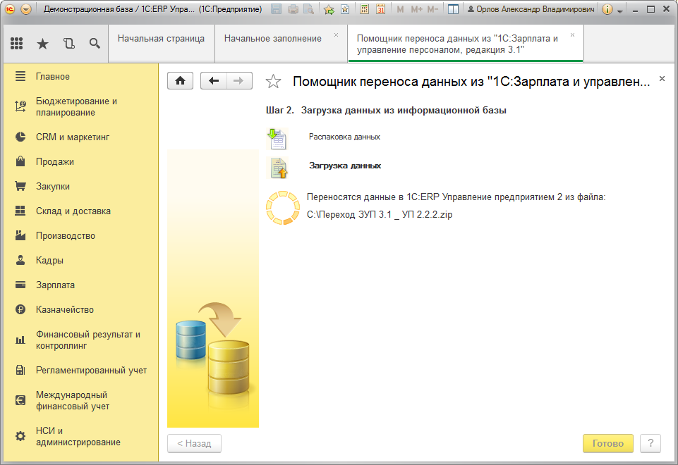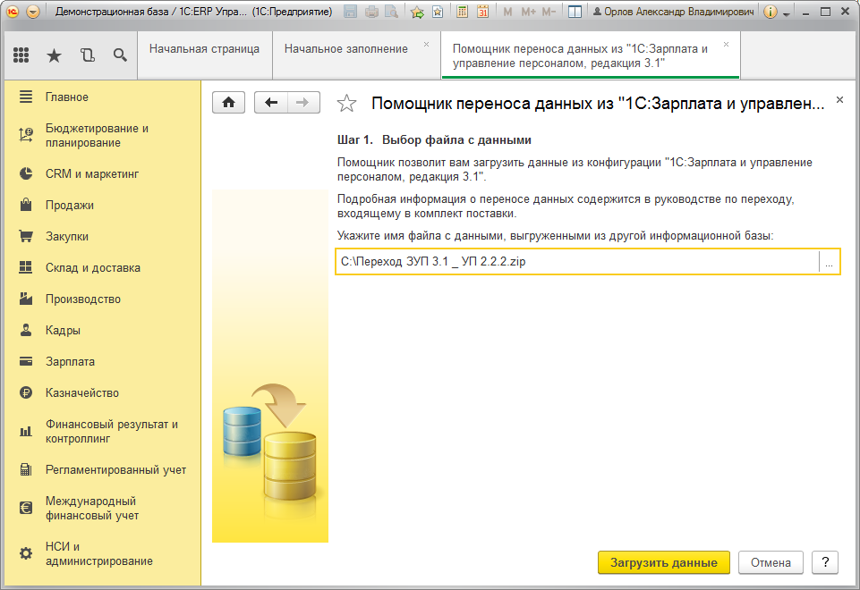 Помощник загрузки данных из ЗУП расположен на странице начального заполнения информационной базы (НСИ и администрирование → Начальное заполнение → Начальное заполнение).