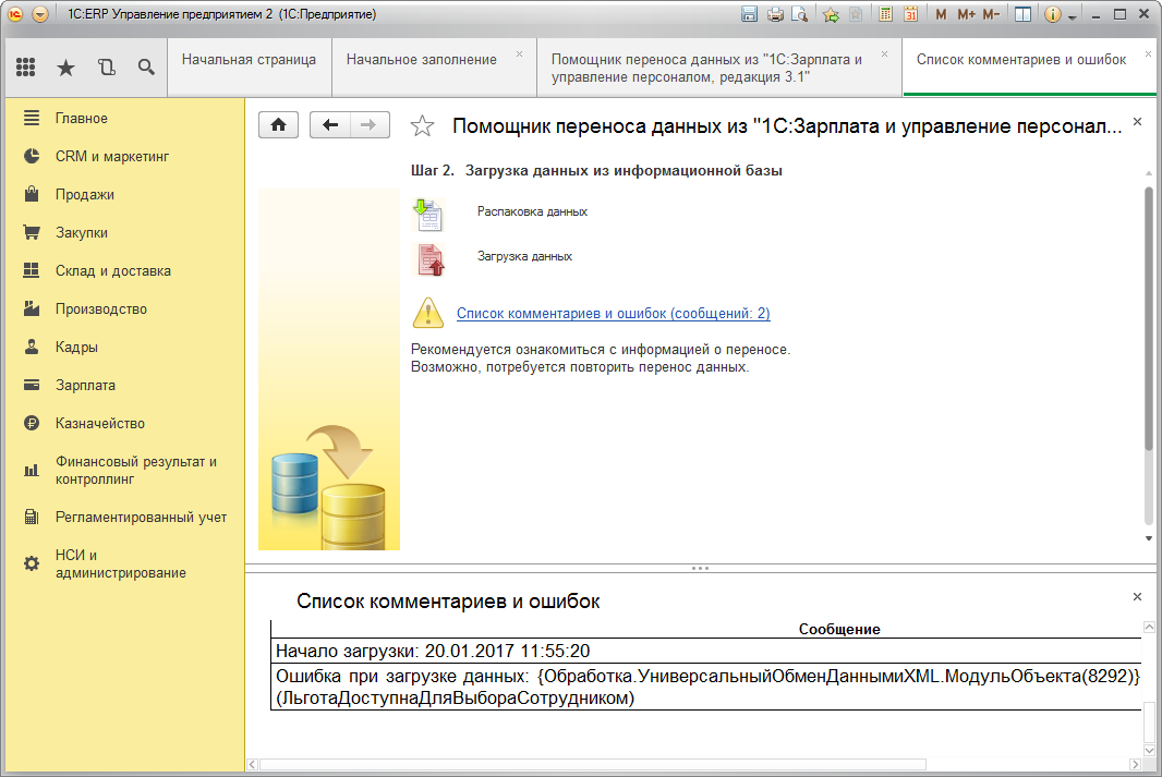 Сообщения об ошибках, возникающих при загрузке, носят более технический характер. Их наличие, как правило, свидетельствует о проблемах, препятствующих дальнейшему корректному переносу данных. О таких ошибках необходимо сообщать в отдел технической поддержки (http://1c.ru/rus/support/support.htm).
