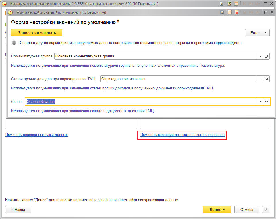 В случае двустороннего обмена следует нажать гиперссылку Изменить значения автоматического заполнения и указать склад для подстановки в документы по умолчанию. В качестве склада по умолчанию можно указать оптовый склад, который является в системе основным.