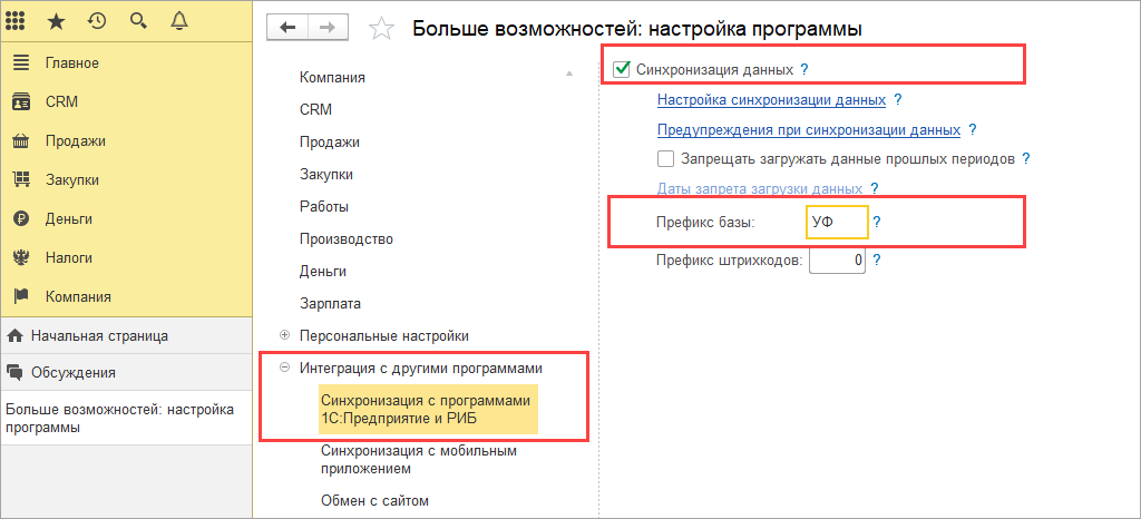 Рекомендуется начинать настройку синхронизации в базе 1С:УНФ (рис.1).