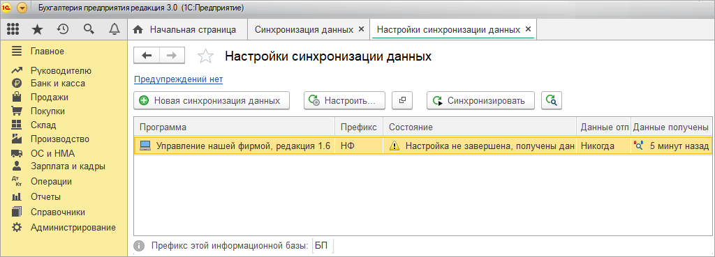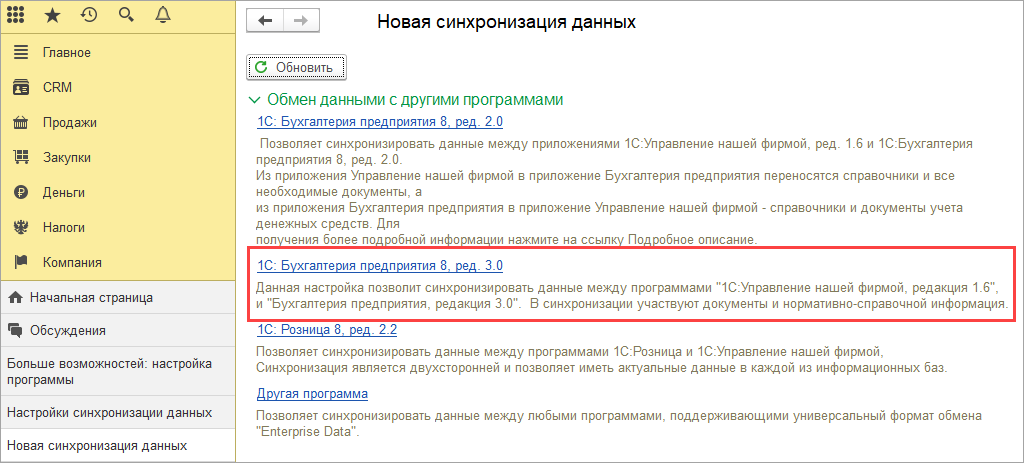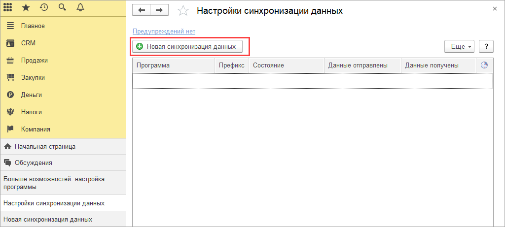 Для начала создайте новую настройку: Настройки синхронизации данных – Новая синхронизация данных.