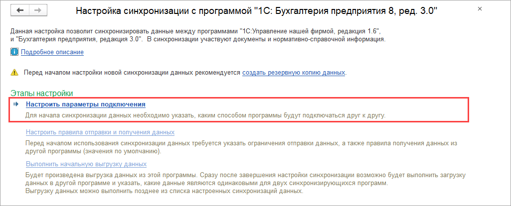 Важно! Перед первой настройкой синхронизации сделайте резервные копии обеих информационных баз.