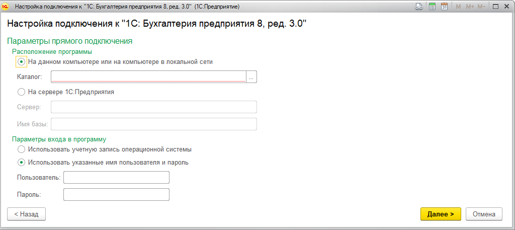 Если подключаетесь к базе на том же компьютере или в локальной сети, то укажите расположение базы, введите логин и пароль пользователя с правами администратора.