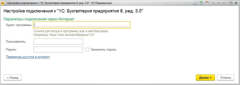 Если подключаетесь к базе, расположенной в сервисе 1cfresh.com, или информационной базе, опубликованной в интернете, укажите ссылку на размещение базы,