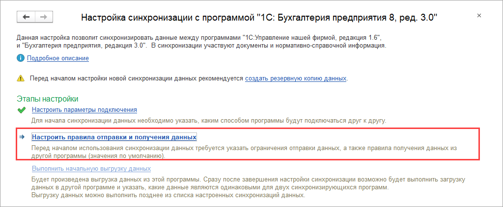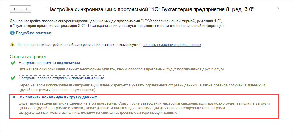 Переходите к завершающему этапу первоначальной настройки синхронизации Выполнить начальную выгрузку данных.