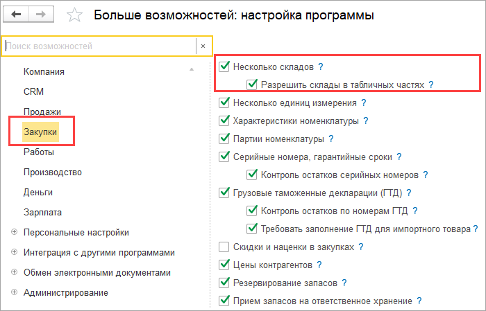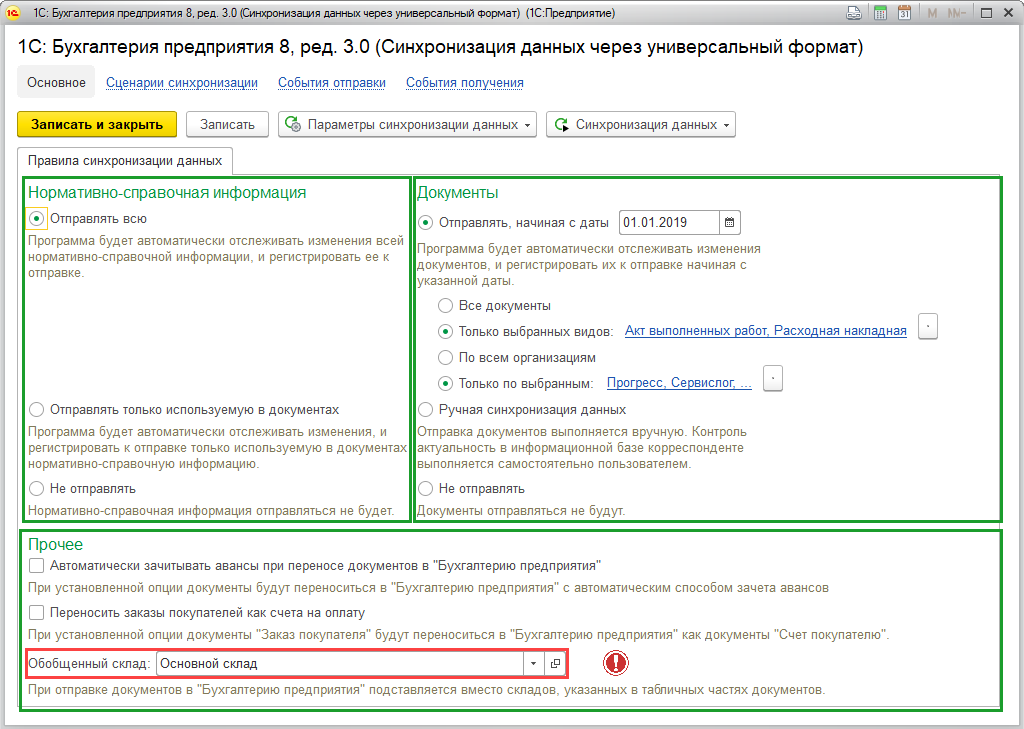 Важно! Укажите обобщенный склад, если ведете в 1С:УНФ учет по нескольким складам в табличной части документов. В 1С:БП эта информация будет перенесена на выбранный Обобщенный склад.