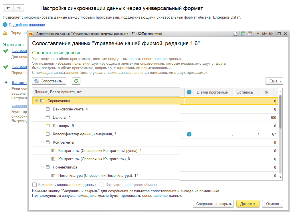 Для загрузки полученных данных из 1С:БП выполните сопоставление и загрузку полученных данных в 1С:УНФ.