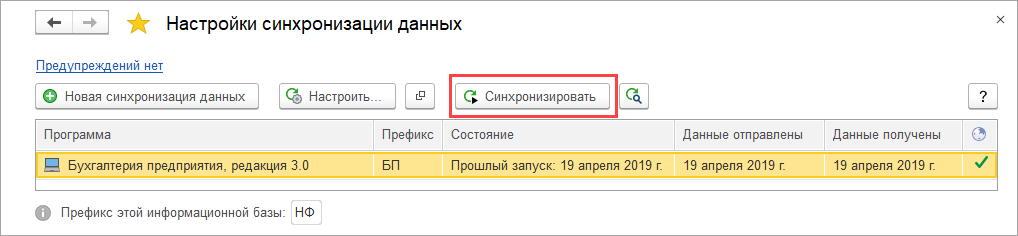 В окне настроек синхронизации данных в 1С:УНФ выберите Синхронизировать.