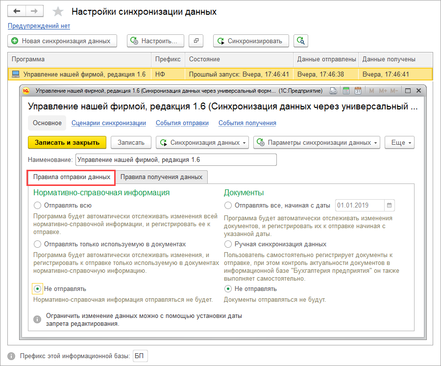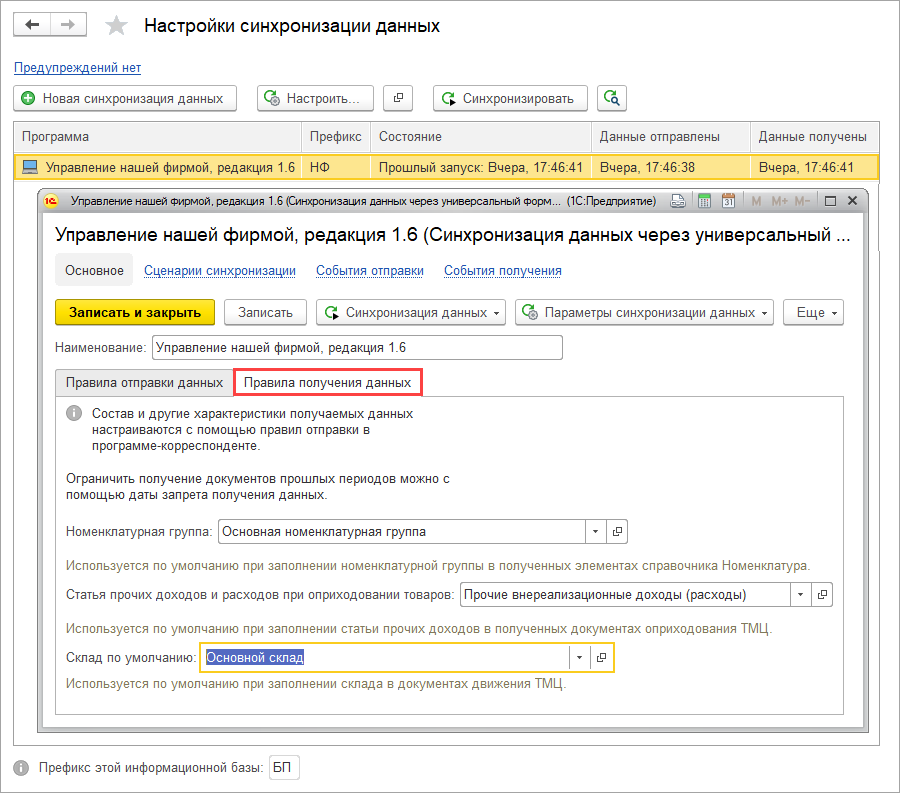 В 1С:БП аналогично 1С:УНФ устанавливаем правила для получении и отправки информации.
